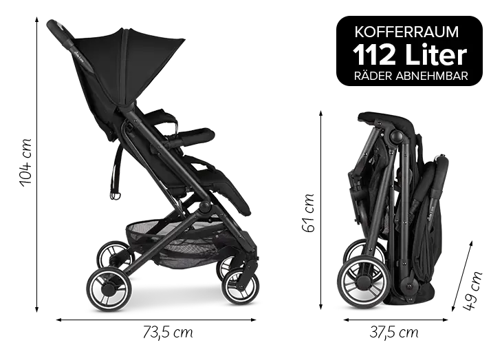 Mit nur einer Hand kannst Du den Buggy kinderleicht lenken, zusammenklappen und wieder auffalten. Dank seines extra kompakten Faltmaßes kannst Du ihn problemlos verstauen oder auf Reisen mitnehmen – sogar ins Flugzeug.